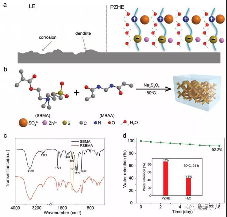 盡管水系鋅金屬電池具有安全、經(jīng)濟(jì)、環(huán)保等優(yōu)點(diǎn),但鋅金屬在水系環(huán)境中枝晶的生長和不可避免的腐蝕問題嚴(yán)重制約了其進(jìn)一步的發(fā)展。在本文中,為了實(shí)現(xiàn)鋅的長期可逆沉積/溶解性,天津大學(xué)羅加嚴(yán)教授課題組構(gòu)建出一種室溫離子電導(dǎo)率為32.0 mS cm?1且Zn2+遷移率為0.656的聚兩性離子水凝膠電解質(zhì)(PZHE),其中兩性離子聚合物中豐富的親水基團(tuán)和帶電基團(tuán)能很好地固定聚合物骨架中的水分子,從而減少電池副反應(yīng)的發(fā)生。此外,兩性離子聚合物中的帶電基團(tuán)可以使離子分布均勻,實(shí)現(xiàn)均勻的鋅沉積。因此,含有PZHE的對(duì)稱電池可穩(wěn)定運(yùn)行3500 h以上,以VS2和MnO2為正極的全電池也表現(xiàn)出優(yōu)異的循環(huán)穩(wěn)定性。由于將物理和化學(xué)交聯(lián)凝膠的優(yōu)點(diǎn)進(jìn)行結(jié)合,因此所合成出的PZHE使柔性準(zhǔn)固態(tài)鋅金屬電池具有優(yōu)異的可加工性、自愈性和安全性,即使在切割、浸泡、錘擊、清洗、燃燒和冷凍等各種極端條件下也能穩(wěn)定工作。