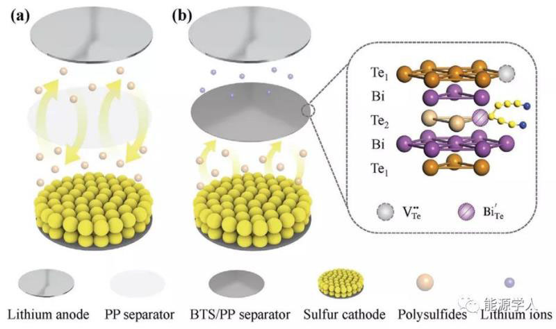 在本文中,華中科技大學(xué)黃云輝教授、李真教授課題組成功將Bi2Te2.7Se0.3 (BTS)引入隔膜表面形成本征反位缺陷,并系統(tǒng)研究了這些缺陷對(duì)鋰硫電池性能的影響。BTS是一種具有高密度反位缺陷的典型化合物,其具有來源豐富,價(jià)格低廉,對(duì)環(huán)境無害等優(yōu)點(diǎn)。在BTS中,反位缺陷Bi′Te與Te空位V′Te共存,而前者是主要的本征缺陷。作者通過磁控濺射法在聚丙烯(PP)隔膜(簡稱為BTS/PP)上設(shè)計(jì)出納米級(jí)BTS界面層,該超薄納米BTS界面層的面積質(zhì)量密度位0.03 mg cm?2,成功避免了整個(gè)電池系統(tǒng)能量密度的損失。因此,所設(shè)計(jì)出的電極具有很高的載硫量和優(yōu)異的電化學(xué)性能。此外,采用密度泛函理論(DFT)計(jì)算,作者探討了多硫化鋰物種與BTS反位缺陷之間的相互作用,表明多硫化物在充放電過程中會(huì)被本征的反位缺陷有效地阻擋。