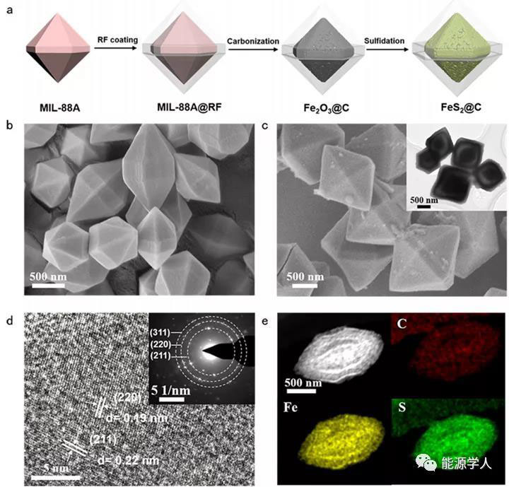 能源和環(huán)境是現(xiàn)代社會(huì)可持續(xù)發(fā)展的關(guān)鍵因素,其中高性能可充電電池在電能存儲(chǔ)方面受到高度重視。目前,由于地球上具有豐富的鈉(Na)儲(chǔ)量,因此鈉離子電池(SIBs)被認(rèn)為是一個(gè)可以應(yīng)用于千兆瓦規(guī)模儲(chǔ)能的理想選擇。近年來,科研人員開發(fā)出的高效SIB負(fù)極材料主要包括碳材料、過渡金屬氧化物、過渡金屬硫化物和合金材料,其中FeS2因具有較高的理論容量(894 mA h g–1)而備受關(guān)注。然而,該材料在反復(fù)鈉化/脫鈉過程總伴隨著巨大的體積變化,因此導(dǎo)致電極的嚴(yán)重粉化和快速的容量衰減。因此,合理設(shè)計(jì)FeS2的結(jié)構(gòu)與形貌,對(duì)其在SIBs中的應(yīng)用至關(guān)重要。另一方面,高效電磁波(EMW)吸收材料在民用/軍用電子設(shè)備和通信設(shè)施中也受到廣泛的關(guān)注。但是單組份的金屬硫化物由于較差界面阻抗失配和較小的比表面積,導(dǎo)致其損耗路徑有限。通過含碳材料對(duì)過渡金屬硫化物進(jìn)行包覆以形成蛋黃殼結(jié)構(gòu),可以有效解決上述問題。因此,具有可控蛋黃殼結(jié)構(gòu)的金屬硫化物/碳復(fù)合材料可作為非常有前景的高效吸波材料。