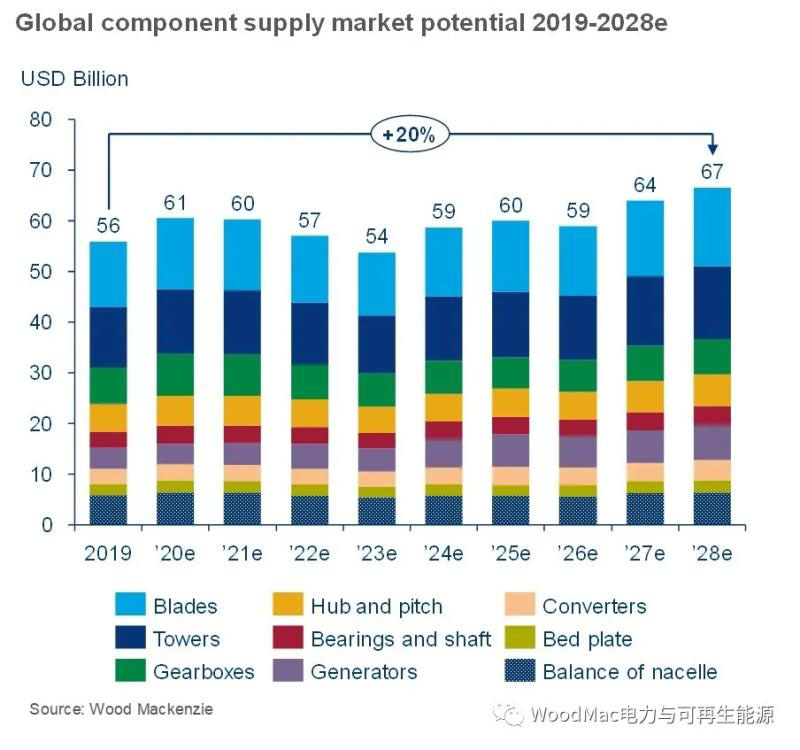 據(jù)伍德麥肯茲最新研究報(bào)告《2020年全球風(fēng)機(jī)供應(yīng)鏈?zhǔn)袌?chǎng)研究》,預(yù)計(jì)2020年至2028年期間,全球風(fēng)機(jī)供應(yīng)鏈潛在市場(chǎng)價(jià)值將達(dá)到6千億美元,較2019年預(yù)測(cè)數(shù)據(jù)上調(diào)8%。