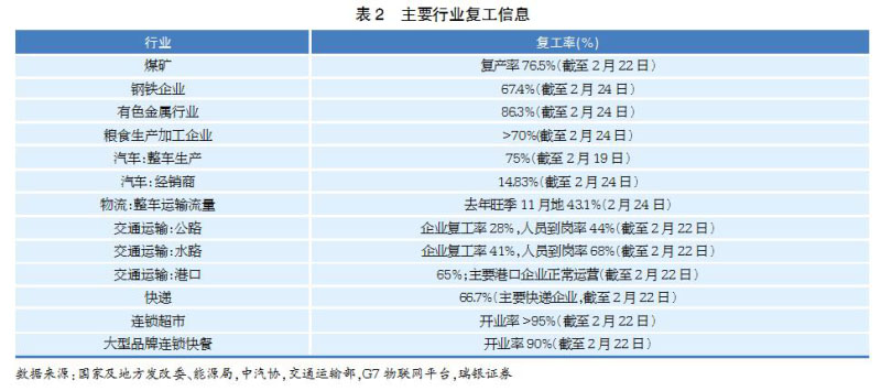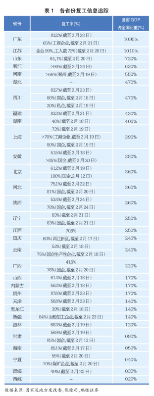 新冠疫情暴發(fā)以來,為防止疫情擴散,除去武漢等13個城市封城以外,大多數(shù)省份選擇延遲復工復產(chǎn)、嚴格實施出行管控。雖然自2月以來,國內(nèi)政策重心已由防控疫情逐漸向企業(yè)復工傾斜,各地區(qū)開始分層分級推動有序復工,但復工效率不及預期。由于地方隔離措施無法統(tǒng)一,返工人員明顯不足、交通物流依然不暢、產(chǎn)業(yè)鏈上下游尚未匹配、口罩等防疫物資持續(xù)不足,因此地區(qū)公布的企業(yè)復工數(shù)據(jù)僅代表企業(yè)獲得復工許可,產(chǎn)能實質(zhì)上未得到充分利用,“復工難復產(chǎn)”問題依然嚴峻。真正的全面復工可能需要到3月中下旬甚至更晚,而服務(wù)業(yè)的復工進度更慢(注1)(見表1)。