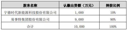 其中易事特以自有資金認(rèn)繳出資9000萬元,占90%股權(quán);寧德時代認(rèn)繳出資1000萬元,占10%股權(quán)。