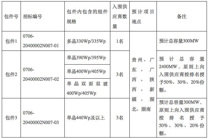 本次招標(biāo)組件主要用于貴州、廣東、廣西、陜西、新疆、湖北、湖南項(xiàng)目,報(bào)名參與包件2的投標(biāo)人必須對包件2內(nèi)包含的全部規(guī)格的光伏組件進(jìn)行報(bào)價(jià),不接受聯(lián)合體投標(biāo),最終供貨需求以項(xiàng)目實(shí)際落地容量為準(zhǔn),5月9日開標(biāo)。
