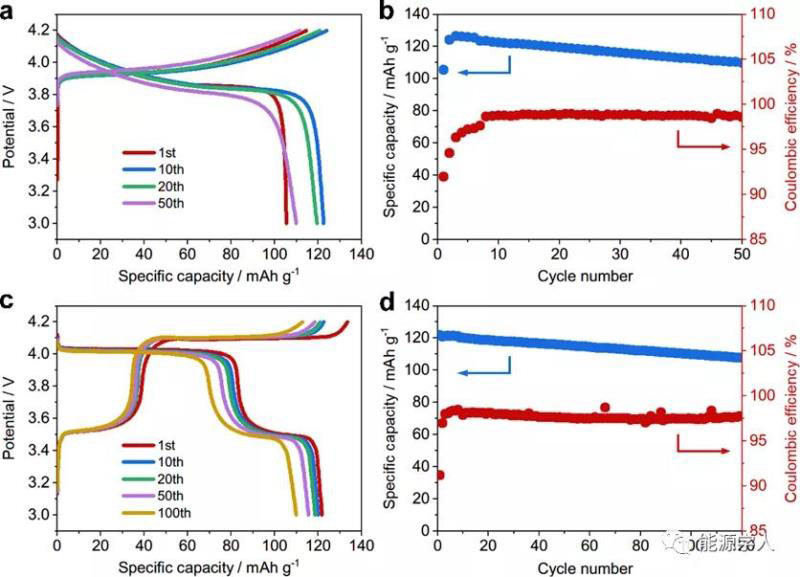 圖5 使用不同正極材料時(shí)PEO全固態(tài)電池的充放電曲線與循環(huán)性能。(a,b) LATP包覆LiCoO2;(c,d)LiMn0.7Fe0.3PO4。