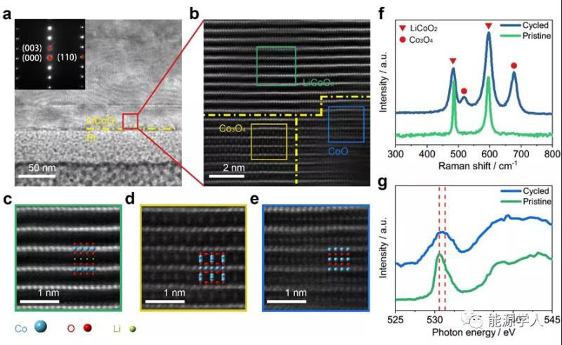圖4 LiCoO2表面結(jié)構(gòu)與成分表征。(a-e)電池失效后鈷酸鋰顆粒的TEM表征,(a)明場像;(b)表面區(qū)域的暗場像;(c-e)圖b中標(biāo)記位置的放大圖像。以及原始極片與失效后極片的(f)拉曼和(g)XAS表征。