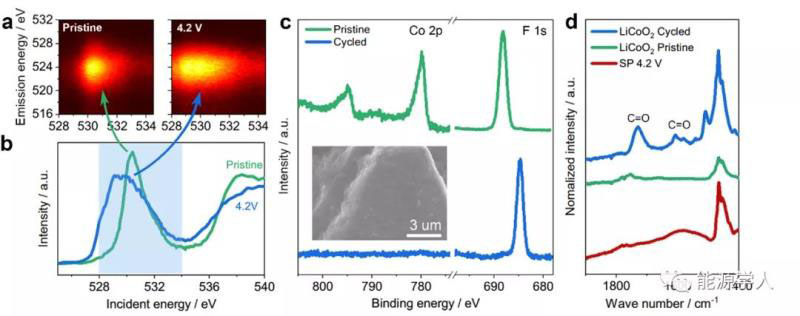 圖3 原始鈷酸鋰和4.2V充電態(tài)鈷酸鋰的(a)RIXS和(b)XAS表征;(c)循環(huán)前后電極表面的XPS(插圖為失效后電極表面形貌)和(d)紅外光譜對比。其中SP電極為4.2V恒壓48小時(shí)后的表征結(jié)果。