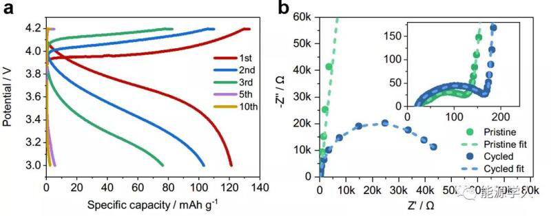 圖2 LCO|PEO-LiTFSI|Li電池(a)循環(huán)不同周次時(shí)的充放電曲線和(b)循環(huán)前后的阻抗測試及擬合結(jié)果。