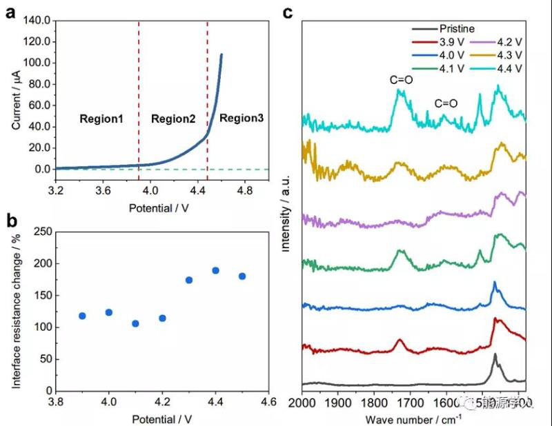 圖1 基于碳惰性電極SP|PEO-LiTFSI|Li電池的(a) LSV測試;(b)在不同電位下恒壓48小時(shí)后與原始阻抗值的對比;(c)不同電位下氧化產(chǎn)物的紅外光譜表征。