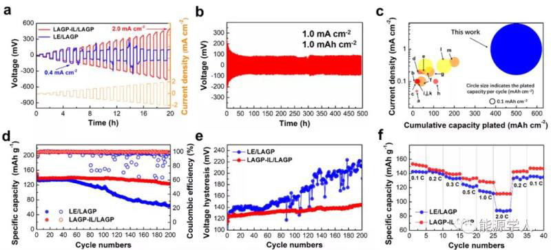 研究者報(bào)道了一種基于具有高化學(xué)穩(wěn)定性和熱穩(wěn)定性的離子液體電解質(zhì)和固態(tài)電解質(zhì)顆粒的復(fù)合中間層用于構(gòu)建LAGP固態(tài)電解質(zhì)和鋰負(fù)極的低阻抗界面。采用該中間層的Li|LAGP-IL/LAGP|Li對稱電池在高電流密度下的循環(huán)性能(1 mA cm-2循環(huán)500小時(shí))顯著優(yōu)于已有文獻(xiàn)報(bào)道。這種界面改性策略為NASCION基固態(tài)鋰金屬電池界面問題的解決提供了一種新思路。