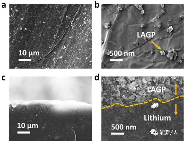 圖5. 循環(huán)后鋰金屬負(fù)極的形貌。a,b)具有LAGP‐IL中間層的鋰電極的形貌。c,d)具有LAGP‐IL中間層的鋰電極的截面形貌。
