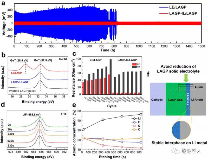 圖4. 使用LAGP-IL中間層時(shí)LAGP固態(tài)電解質(zhì)和鋰金屬負(fù)極的界面穩(wěn)定性。a)在0.1mA cm-2電流密度下,Li|LAGP‐IL/LAGP|Li對稱電池的電壓曲線。b)LAGP‐IL/LAGP固態(tài)電解質(zhì)表面的Ge 3d的高分辨XPS譜。c)鋰對稱電池在不同循環(huán)周數(shù)下的EIS阻抗。d-e)具有LAGP‐IL中間層的鋰對稱電池循環(huán)后鋰電極表面的元素分析。f)LAGP‐IL中間層的作用示意圖。