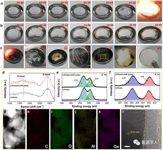 為了揭示中間層顯著改善熱穩(wěn)定性的原因,研究者使用拉曼光譜,X射線光電子能譜和高分辨率透射電子顯微鏡觀察并表征了反應(yīng)產(chǎn)物。C 1s的高分辨率X射線光電子能譜在284.8和286.3eV處顯示兩個(gè)峰,分別對應(yīng)于C–C和C–N鍵(圖3d),在N 1s光譜中402.1 eV處檢測到C–N鍵(圖3e)。在拉曼光譜中觀察到的G峰(1580 cm-1)證明了無定形碳的產(chǎn)生。上述結(jié)果表明離子液體陽離子和陰離子的分解產(chǎn)生無定型碳。圖3l結(jié)果表明,LAGP納米顆粒被無定形碳包裹。該碳層保證了LAG-IL中間層的穩(wěn)定性。在加熱過程中LAGP固態(tài)電解質(zhì)片和熔融的鋰被中間層完全隔離,從而避免了潛在的熱失控風(fēng)險(xiǎn)。