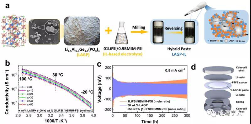 圖2. LAGP-IL中間層的制備和相應(yīng)的電化學(xué)性能。a)LAGP-IL中間層的制備示意圖(LAGP納米顆粒的質(zhì)量分?jǐn)?shù)為50%)。b)不同LAGP質(zhì)量分?jǐn)?shù)的LAGP‐IL中間層的離子電導(dǎo)率隨溫度的變化。c)在電流密度為0.5 mA cm -2的情況下,使用中間層的Li|LAGP-IL|Li對稱電池的循環(huán)穩(wěn)定性(電池示意圖顯示于d中)。