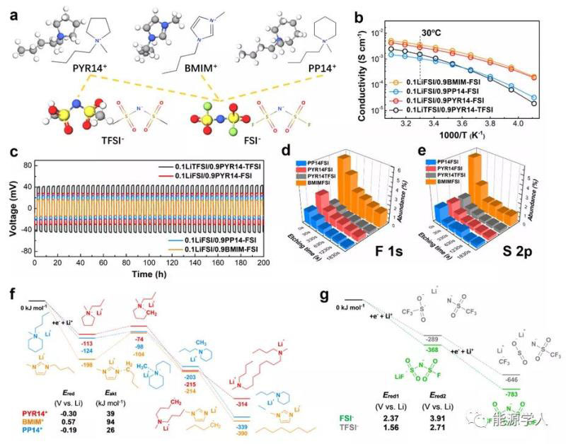 圖1. 鋰金屬/離子液體的界面穩(wěn)定性研究。a)離子液體的陽離子和陰離子的化學(xué)結(jié)構(gòu)。b)離子液體電解質(zhì)的離子電導(dǎo)率隨溫度的變化規(guī)律。c)具有不同離子液體電解質(zhì)的Li|IL|Li對稱電池在0.1 mA cm -2的電流密度下的循環(huán)穩(wěn)定性。d,e)在使用離子液體電解質(zhì)循環(huán)后,鋰電極SEI膜中的氟和硫元素分布。f,g)離子液體電解質(zhì)的分解路徑。