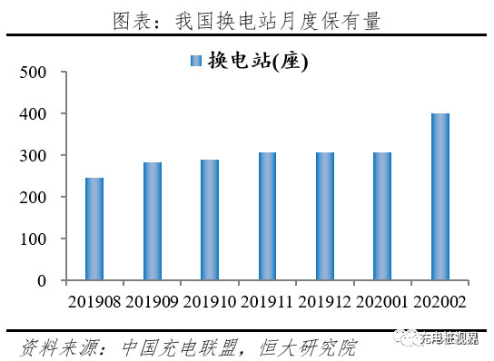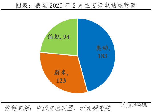 公共充電領域,慢充所需時間長,快充存在安全隱患且導致電池衰減嚴重等問題;相比公共充電而言,換電模式可迅速補充能源,解決里程和充電焦慮并降低購置成本。但是換電模式缺點也很明顯,建站成本高、電池規(guī)格難統(tǒng)一,無法解決電池所有權問題;所以換電模式比較適合在公交車和運營車上使用,因為兩者標準化程度高,而且對運營效率要求更嚴。在私家車領域,由于定制化屬性強,換電模式只適用自家車型,更適合有一定銷量規(guī)模的車企。據(jù)充電聯(lián)盟統(tǒng)計,截至2020年2月,我國換電站保有量400座,相比2019年8月245座增加63.3%;主要運營商有三家,奧動、蔚來、伯坦分別運營183、123、94座。