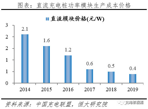 據(jù)中國充電聯(lián)盟披露,截至2019年12月,我國公共充電樁交流樁和直流樁分別占比58%、42%;2019年新增公共充電樁交流樁、直流樁分別占比58%、42%。以公共直流樁為例,其核心零部件直流模塊(切換交流成直流)成本占比較高,近80%;近幾年成下降趨勢,降幅逐漸趨緩,截止到2019年價格在0.4元/W左右;根據(jù)下列合理假設,測算其實現(xiàn)盈虧平衡的充電利用率應在8-10%之間,與主流充電樁運營商反饋基本一致。