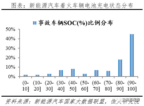 據(jù)新能源汽車國家大數(shù)據(jù)聯(lián)盟披露,從2019年5月1日至2019年底,國家平臺監(jiān)測和統(tǒng)計的新能源車輛事故共計113起。其中在著火事故車輛中,處于充電狀態(tài)、充滿電后靜置狀態(tài),最容易發(fā)生著火事故,分別占比38%和24%。另外,新能源汽車著火事故大多發(fā)生在高SOC狀態(tài);SOC在90%以上的事故占比達到45%,SOC在95%以上占比29%。