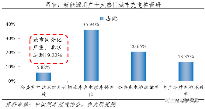 2019年8月,中國汽車流通協(xié)會發(fā)布的《2019新能源汽車消費市場研究報告》披露:針對新能源用戶十大熱門城市(北京、上海、深圳等)公共充電樁調(diào)查顯示,主要有四類問題導致部分公共充電樁不能用:1)5.82%的公共充電樁不對外開放,且各城市分化嚴重,北京這一比例高達19.22%;2)35.94%的公共充電樁停車位被燃油車占領;3)20.65%的公共充電樁發(fā)生故障;4)13.33%的自主品牌充電樁相互不兼容。