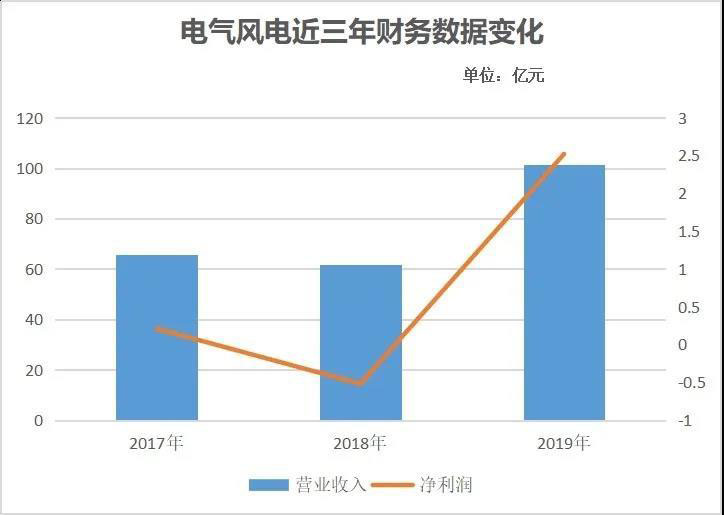 2017年、2018年和2019年,電氣風(fēng)電分別實(shí)現(xiàn)營業(yè)收入65.57億元、61.71億元、101.35億元。