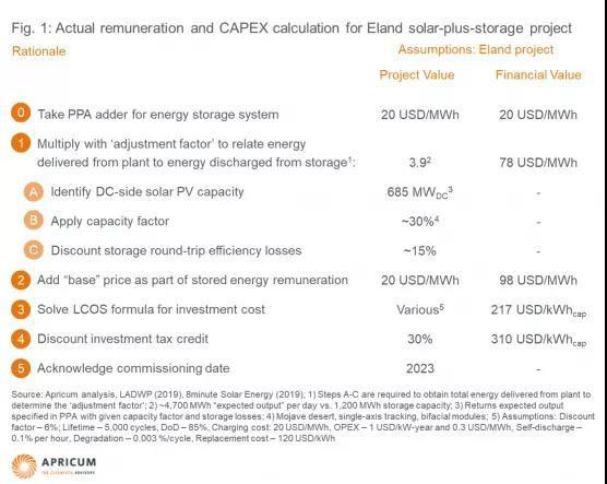 第四步,需要考慮投資稅收抵免(ITC)的部分,以計(jì)入任何對(duì)投資成本的補(bǔ)貼。在美國(guó),ITC最初是對(duì)太陽(yáng)能的一項(xiàng)財(cái)政激勵(lì)措施,但它也適用于存儲(chǔ)光伏電站所發(fā)電量的儲(chǔ)能系統(tǒng)。8minuteSolar Energy在2019年開(kāi)始為Eland光儲(chǔ)項(xiàng)目建設(shè)了一個(gè)變電站,所以它仍可以獲得30%的ITC(2020年,補(bǔ)貼比例將退坡至26%),這大大降低了儲(chǔ)能系統(tǒng)的有效資本支出??紤]到這一激勵(lì)因素,項(xiàng)目最終的資本支出為310美元/kWhcap。