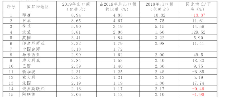 韓國,2019年出口韓國金額為11.27億美元,占中國總出口額為6.09%,2018年出口韓國金額為11.38億美元,同比下降了0.97%。