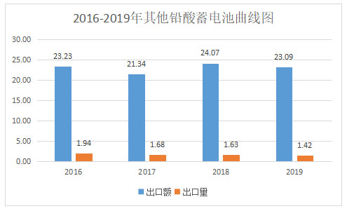 4、2016-2019年其他鉛酸蓄電池出口曲線圖(出口額單位:億美元;出口量單位:億只)