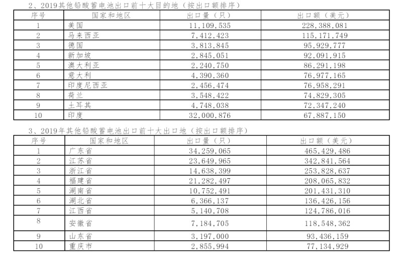 1、2019年其他鉛酸蓄電池出口量為1.42億只,2018年出口量為1.63億只,與上一年相比,同比下降了12.88%。2019年其他鉛酸蓄電池出口額為23.09億美元,2018年出口額為24.07億美元,同比下降了4.07%。