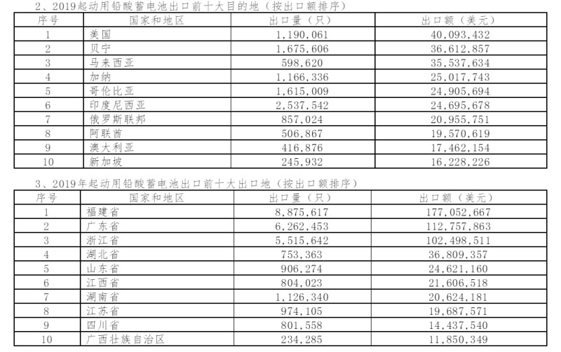 1、2019年起動用鉛酸蓄電池出口量為2781萬只,2018年出口量為2708萬只,與上一年相比,同比上漲了為2.70%。2019年起動用鉛酸蓄電池出口額為5.89億美元,2018年出口額為5.50億美元,同比上漲了為7.09%。