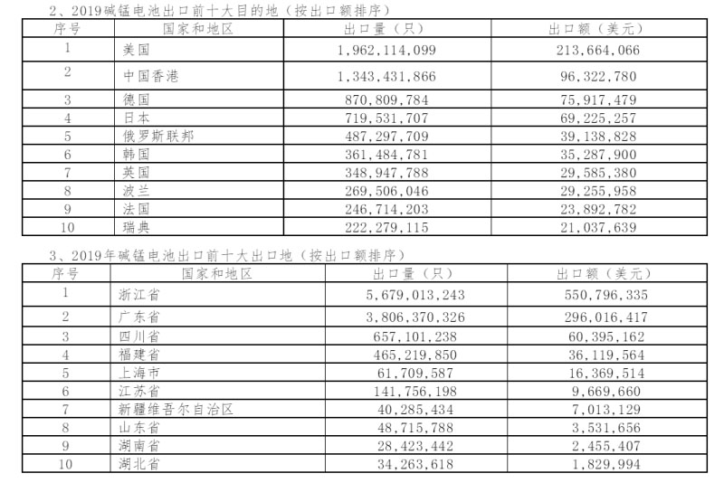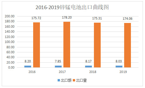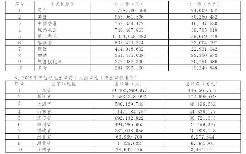 1、2019年鋅錳電池出口量為174.06億只,2018年出口量為175.31億只,與上一年相比,同比下降了為0.71%。2019年鋅錳電池出口額為8.03億美元,2018年出口額為8.17億美元,同比下降了1.71%。