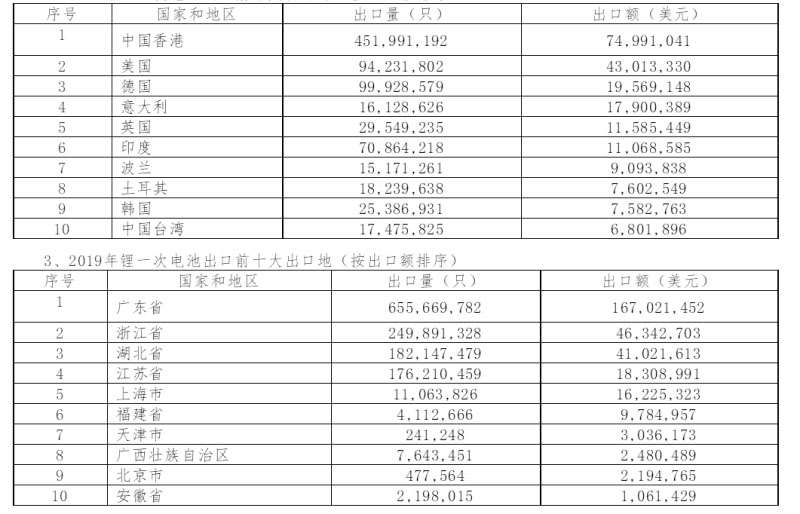 1、2019年鋰一次電池出口量為13.24億只,2018年出口量為12.93億只,與上一年相比,同比上漲了2.40%。2019年鋰一次電池出口額為3.11億美元,2018年出口額為3.14億美元,與上一年相比,同比下降了0.96%。