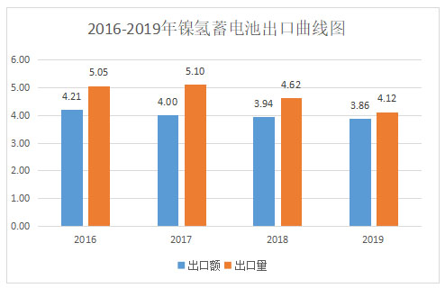 4、2016-2019年鎳氫蓄電池出口曲線圖(出口額單位:億美元;出口量單位:億只)