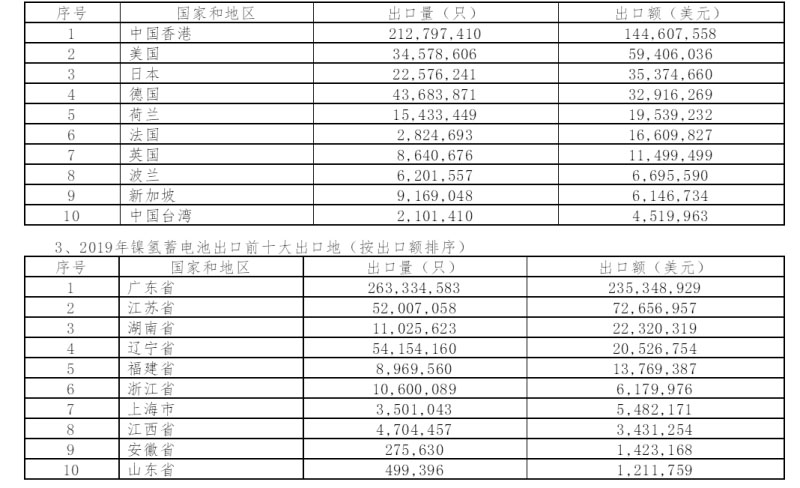 1、2019年鎳氫蓄電池出口量為4.12億只,2018年出口量為4.62億只,與上一年相比,同比下降了10.82%。2019年鎳氫蓄電池出口額為3.86億美元,2018年出口額為3.94億美元,與上一年相比,同比下降了2.07%。