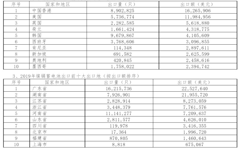 1、2019年鎳鎘蓄電池出口量為0.48億只,2018年鎳鎘蓄電池出口量為0.59億只,與上一年相比,同比減少了18.64%。2019年鎳鎘蓄電池出口額為0.83億美元,2018年鎳鎘蓄電池出口額為0.93億美元,與上一年相比,同比下降了12.05%。