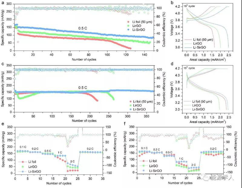 進(jìn)一步在全電池測(cè)試中證實(shí)了電化學(xué)性能的提高。分別使用Li箔、Li-rGO和Li-SirGO(~10mAh cm-2)與NMC532正極(~2.5mAh cm-2)組裝全電池,同時(shí)在60 μl的1 M LiPF6/EC-DEC-FEC-VC和1 M LiFSI/DME-TFEO的電解液中均能顯示出循環(huán)性能的大幅度提高。這些復(fù)合鋰金屬負(fù)極不僅可以進(jìn)一步增強(qiáng)可充能力,還進(jìn)一步降低了循環(huán)中的過(guò)電位。