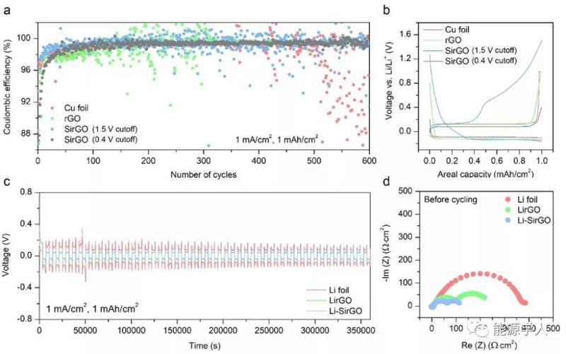為了證明Si納米顆粒的嵌入對(duì)rGO的電化學(xué)性能的影響,通過(guò)組裝半電池在1 mA cm-2,1 mAh cm-2的條件下測(cè)試CE。相比之下,同樣使用1 M LiFSI/DME-TFEO作為電解液的SirGO能夠表現(xiàn)出更高且穩(wěn)定的CE,更加值得注意的是,當(dāng)剝離電壓為1.5V時(shí),SirGO變現(xiàn)出的CE具有更大的波動(dòng),這主要是歸因于一些LixSi顆粒與骨架沒(méi)有完全的電子接觸,導(dǎo)致需要有一次的激活過(guò)程;以及高截止電壓導(dǎo)致LixSi中的Li被脫出,使得電極結(jié)構(gòu)不能被很好保持。因此,將每次循環(huán)的截止電壓設(shè)置為0.4V,使得LixSi中的Li不被脫出,進(jìn)而提高CE的穩(wěn)定性。此外,進(jìn)一步測(cè)試了對(duì)稱(chēng)電池和阻抗,相比未修飾之前,性能均得到大幅度提升。