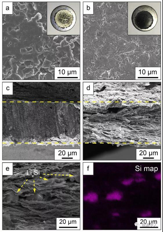 將嵌入層間的Si納米顆粒作為金屬Li沉積的成核種子的策略成功避免了Li優(yōu)先沉積在rGO表面的事實(shí)。隨著石墨烯層間Si納米粒子的存在,Li首先與Si形成合金,隨后再出現(xiàn)鋰金屬的沉積?;谶@樣的工作機(jī)制,通過(guò)圖3的SEM圖像可以看出,使用Si修飾之后的SirGO能夠使金屬Li優(yōu)先沉積在骨架內(nèi)部,相反未修飾的rGO的表面出現(xiàn)大部分Li,由此構(gòu)成的Li-SirGO復(fù)合電極也呈現(xiàn)出超致密的沉積行為。同時(shí)將Li-SirGO的Li剝離后(截止電壓為0.4V),顯示出均勻分布的LixSi的合金顆粒。