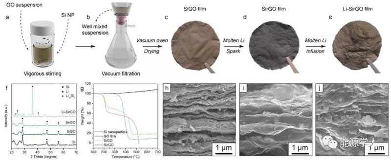 圖2a-e顯示了Li-SirGO復(fù)合負(fù)極的合成過(guò)程。依次將直徑約為100nm的Si納米顆粒通過(guò)劇烈攪拌和超聲處理均勻分散在GO溶液中, 隨后通過(guò)真空過(guò)濾,火花反應(yīng)和熔融Li注入的方式得到Li-SirGO復(fù)合鋰金屬負(fù)極。通過(guò)相應(yīng)的SEM圖像也能夠清晰看出,SirGO具有更大的層間距,能夠嵌入更多的Si納米顆粒。同時(shí),在熔融鋰注入后,在層間充滿了金屬鋰,且伴有LixSi合金形貌的顆粒,也可以通過(guò)相應(yīng)的XRD圖譜得到證實(shí)。