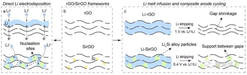圖1. SirGO與傳統(tǒng)rGO的Li沉積行為的對(duì)比示意圖。(a)Li優(yōu)先沉積在SirGO內(nèi)部。反之,Li優(yōu)先沉積rGO頂部;(b)rGO和SirGO原理圖;(c)通過(guò)控制截止電壓(0.4V),保證復(fù)合電極在循環(huán)過(guò)程中的LixSi顆粒不變,從而達(dá)到電極厚度無(wú)變化。