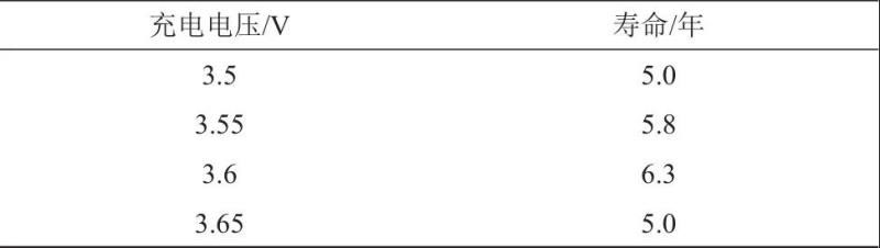 綜合放電容量衰減規(guī)律和直流內(nèi)阻衰減規(guī)律,對(duì)樣品在相同溫度條件不同恒壓充電電壓條件下的備電工況壽命進(jìn)行估算,結(jié)果如表5所示。