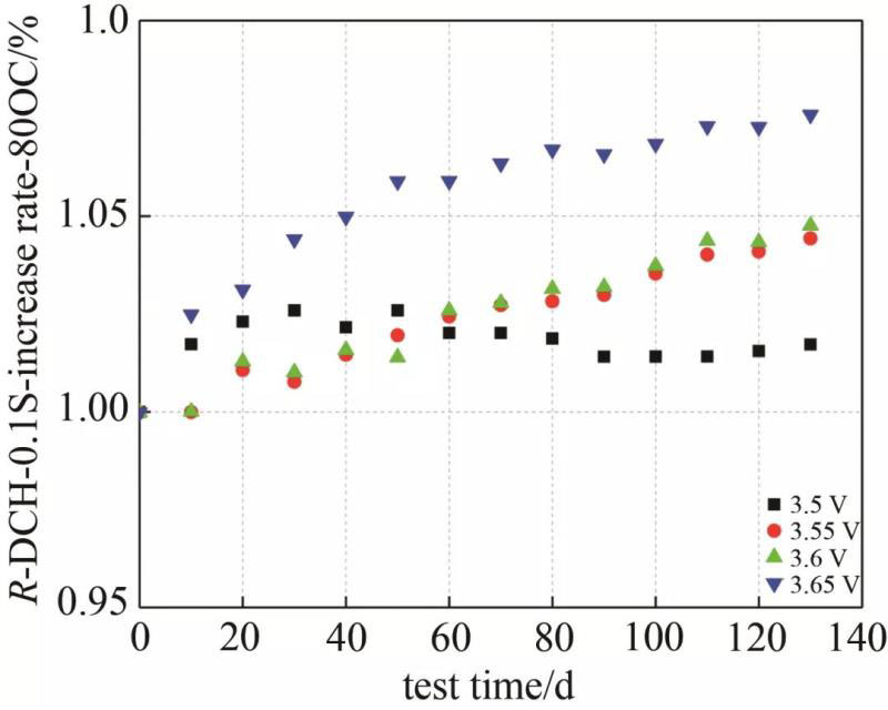 綜上所述,在相同溫度條件下,樣品的放電容量呈線性衰減趨勢(shì),不同充電電壓對(duì)放電容量的影響較小。但是在不同充電電壓條件下,樣品的放電直流內(nèi)阻呈現(xiàn)了不同的趨勢(shì),隨著充電電壓的變高,內(nèi)阻的增長(zhǎng)趨勢(shì)發(fā)生變化,并且增長(zhǎng)幅值變大。