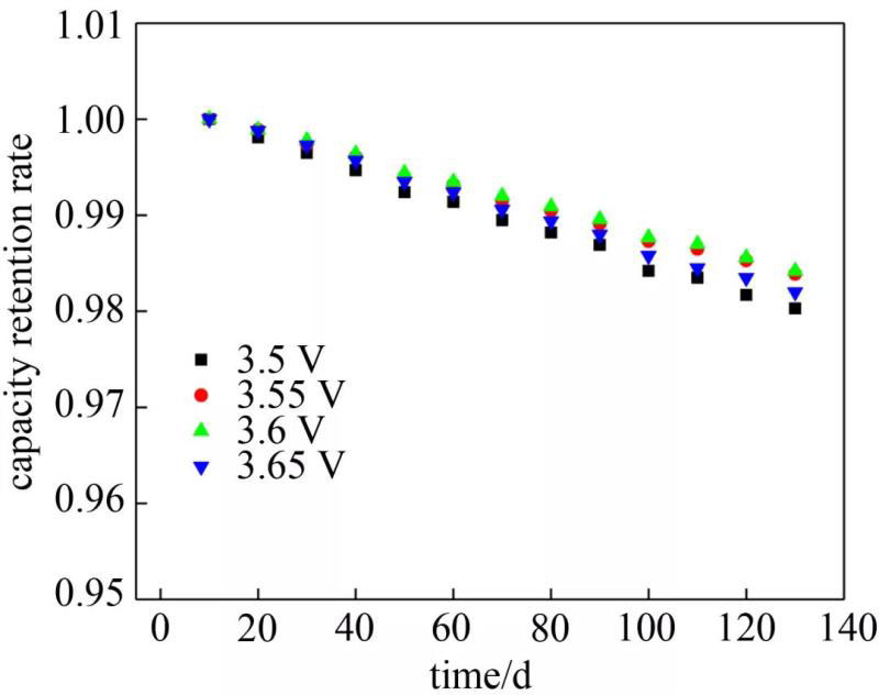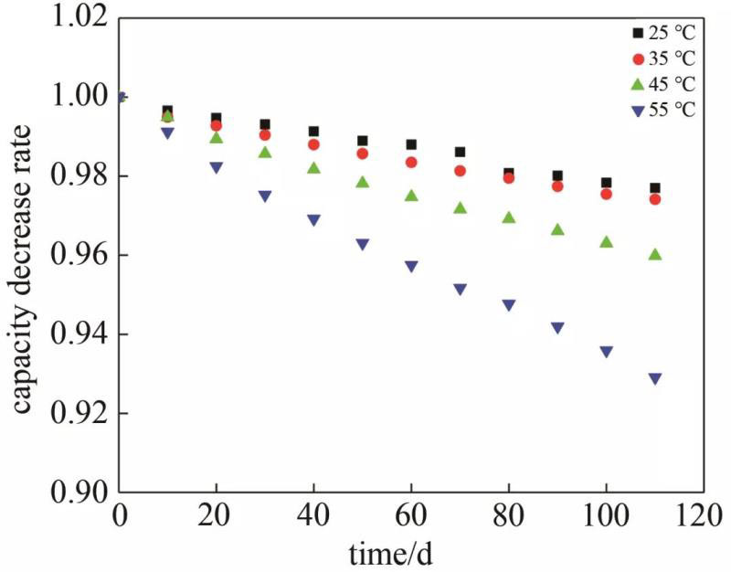 注: 擬合公式為。式中,a是容量保持率初始值;b是容量保持率衰減率;t是試驗(yàn)時(shí)間。