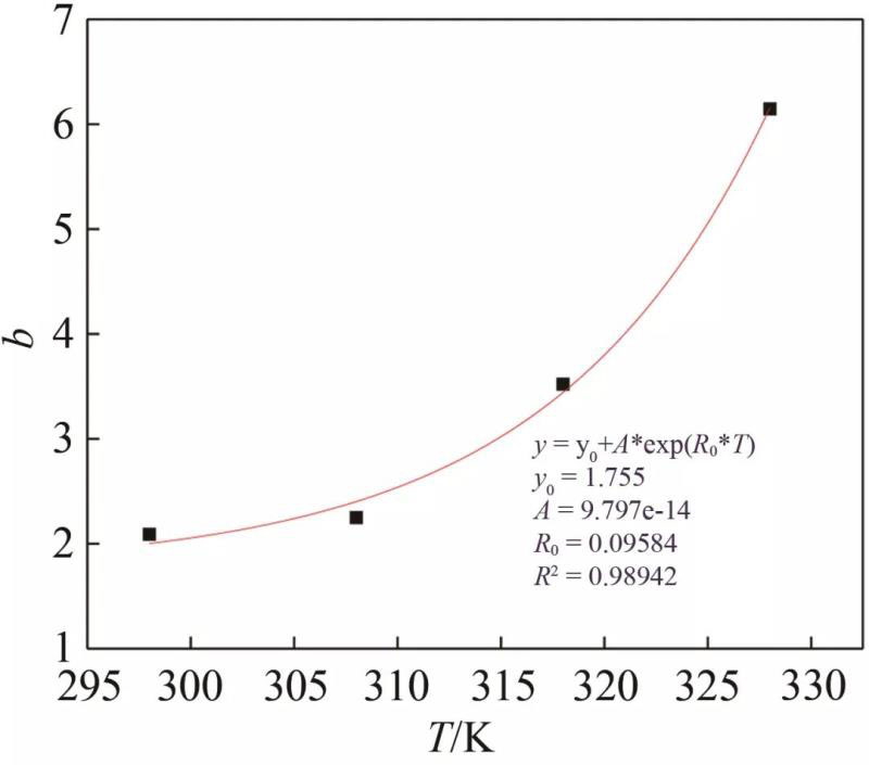 從圖5中可以看出,放電容量保持率衰減率b與溫度之間有較強(qiáng)的關(guān)聯(lián)關(guān)系,對(duì)其進(jìn)行擬合發(fā)現(xiàn),其規(guī)律符合式(1)