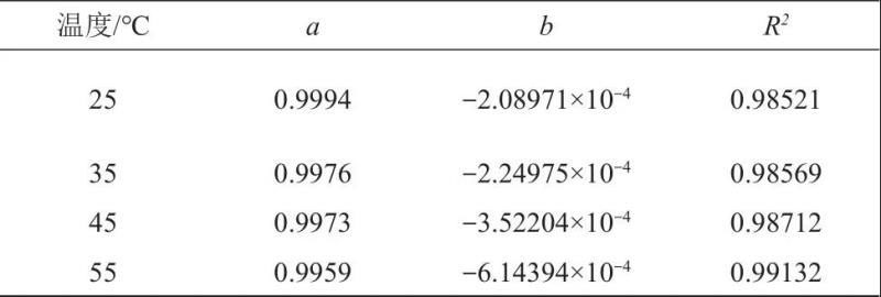 從圖4中可以看出,在不同溫度下,樣品的放電容量保持率呈明顯的線性衰減趨勢(shì),溫度越高,衰減速率和幅值越大。對(duì)不同溫度下樣品的放電容量保持率進(jìn)行線性擬合,擬合結(jié)果如表2所示。