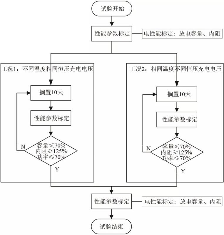 本試驗(yàn)主要包括兩個(gè)主要部分:一是性能參數(shù)標(biāo)定試驗(yàn);二是溫度和恒壓充電電壓雙因素下單體電池工況試驗(yàn)。其中性能參數(shù)標(biāo)定試驗(yàn)包括放電容量標(biāo)定試驗(yàn)和內(nèi)阻標(biāo)定試驗(yàn),詳細(xì)流程如圖3所示。
