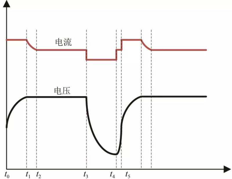 t0~t1:電網(wǎng)向電池系統(tǒng)充電,恒流充電,系統(tǒng)電壓升高;