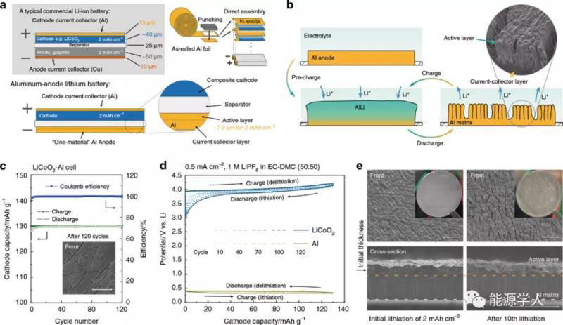 將Al4N-AR箔片作為負(fù)極組裝電池,同時(shí)與鋁集流體合二為一來保持電極結(jié)構(gòu)穩(wěn)定,顯著簡(jiǎn)化了電極的結(jié)構(gòu)和電池制造過程。如圖4b所示,鋁箔負(fù)極在預(yù)充電過程中被部分鋰化,在鋰脫出時(shí)形成柱狀結(jié)構(gòu)并產(chǎn)生一些內(nèi)部孔洞。圖4c,d顯示了LiCoO2-Al電在120個(gè)循環(huán)后,達(dá)到幾乎100%的庫侖效率。如圖4e所示,活性層基本上保持為整體而沒有碎裂,并且活性物質(zhì)層的厚度均未觀察到明顯的差異。