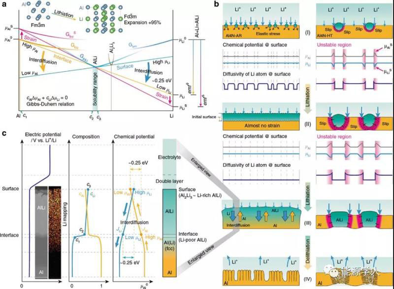 圖3:a) Al-Li二元體系中的吉布斯自由能曲線。b) 機(jī)械硬化和軟鋁箔的鋰化過程的示意圖。c) Li和Al的電勢(shì),組成和化學(xué)勢(shì)的梯度的示意圖