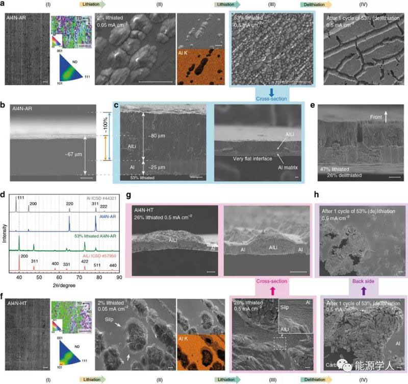 圖2:a)在鋰化和脫鋰過程中,Al4N-AR正面的形態(tài)發(fā)生變化,具有良好結(jié)構(gòu)穩(wěn)定性。b)原始Al4N-AR箔的橫截面。c)53%鋰化的Al4N-AR箔的橫截面,表明沿垂直于鋁箔的方向(一維)發(fā)生體積膨脹。d)鋰化前后在Al4N-AR箔的XRD。e)經(jīng)過了47%鋰化和隨后26%脫鋰的Al4N-AR箔的橫截面,組織結(jié)構(gòu)呈柱狀。f)在鋰化和脫鋰過程中,Al4N-HT的形態(tài)變。g)26%鋰化Al4N-HT箔的橫截面,其中AlLi相穿透箔并伴隨塑性變形。h)經(jīng)過了53%的鋰化和脫鋰循環(huán)的Al4N-HT背面,在脫鋰過程中發(fā)生粉碎。
