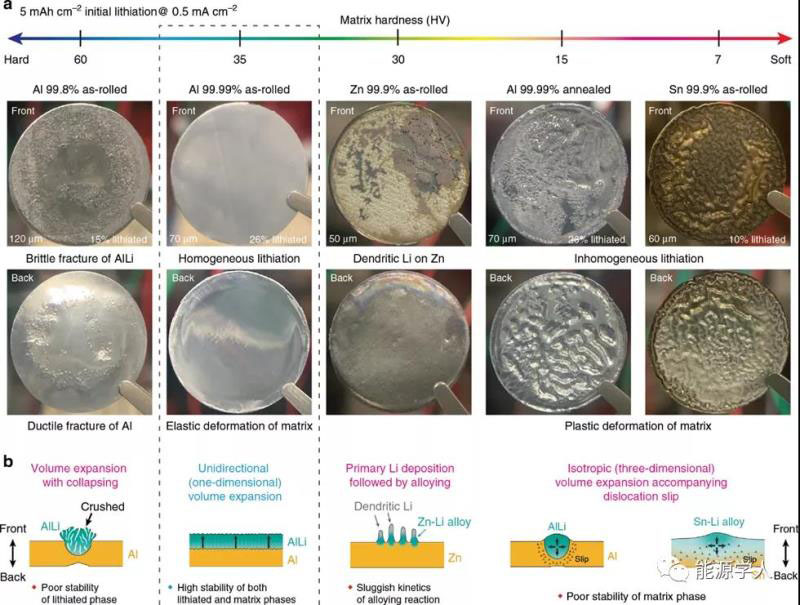 為了探究金屬箔負(fù)極的結(jié)構(gòu)穩(wěn)定性,將鋁箔,鋁箔,鋅箔和錫箔分別在紐扣電池中鋰合金化。作者發(fā)現(xiàn)材料的硬度在很大程度上影響鋰合金化的結(jié)構(gòu)穩(wěn)定性。通過改變純度并控制軋制和熱處理?xiàng)l件來制備三種硬度不同的樣品,每個(gè)維氏硬度(HV)如圖1a所示。在電流密度為0.5mA cm-2的條件下充電面容量為5 mAh cm-2時(shí),鋰化箔具有明顯不同的外觀。對(duì)于小于HV 30的軟金屬,錫箔和退火的4N-Al箔(Al4N-HT)在鋰化后會(huì)發(fā)生局部塑性變形。整個(gè)極片均有不同程度的起伏,這種起伏是通過與鋰合金化而形成的。此外,鋰合金化存在不均勻性,這表明基體的機(jī)械變形(彈性/塑性)強(qiáng)烈影響鋰合金化過程。與軟箔相反,硬軋制2N-Al箔表現(xiàn)出明顯不同的鋰化行為,這表明生長的AlLi合金不會(huì)使Al基體變形。而在背面觀察到了凹痕圖案,表明韌性斷裂是由于正面凸出的AlLi晶粒引起的大拉伸應(yīng)力產(chǎn)生的。