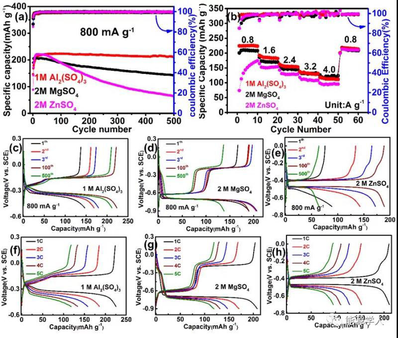 圖5. AQ負極在水系鋅離子,鎂離子和鋁離子電池中的電化學(xué)性能。